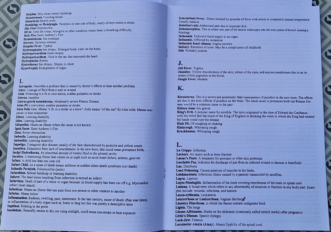 Information included in the publication are the causes of death recorded on almost a 1,000 death certifcates.