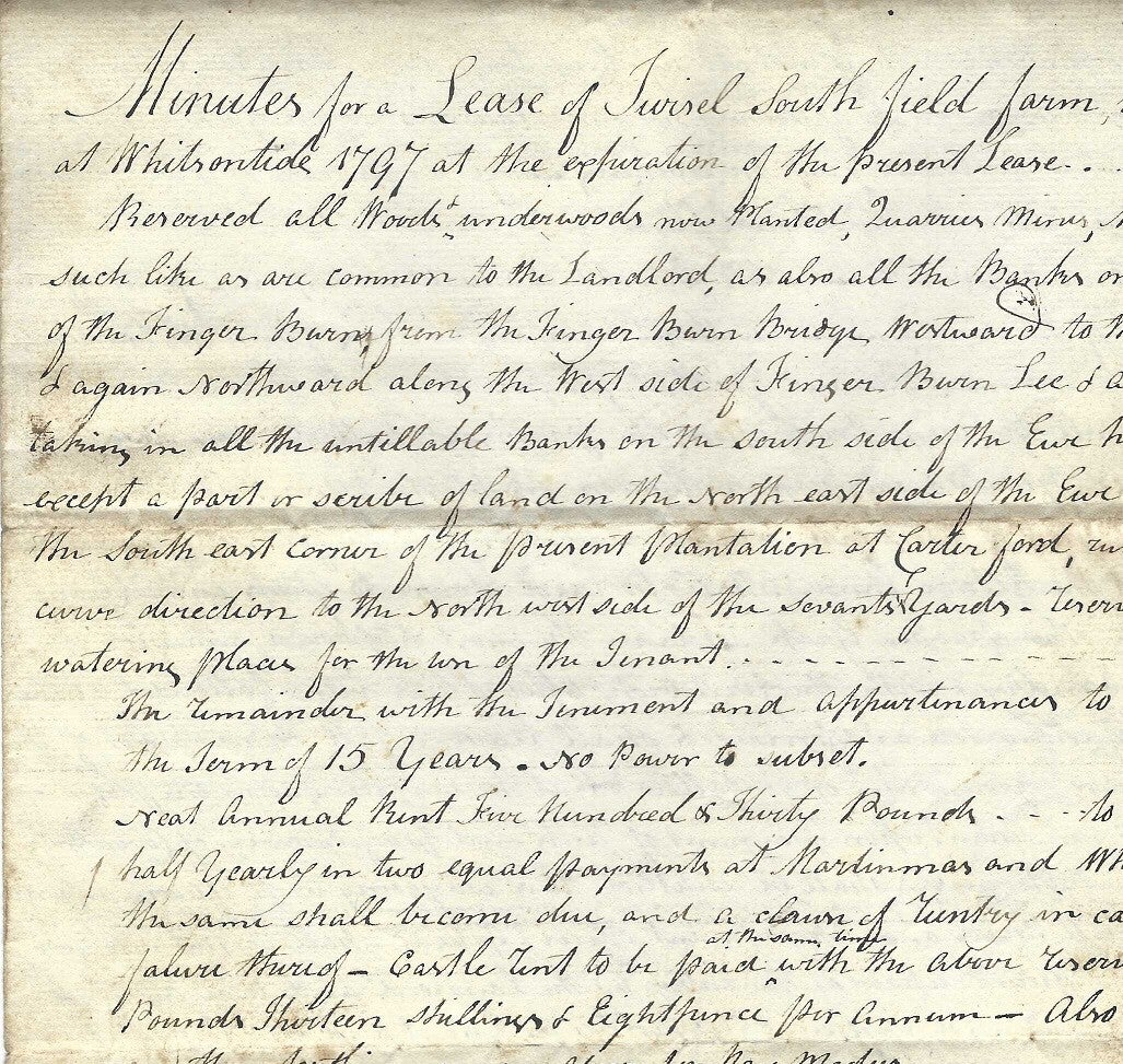 This lease was drawn up in 1797 between Sir Francis Blake, 2nd Baronet of Twisel Castle, land owner and Agnes Bull and John Grace detailing the do's and don'ts concerning the lease.