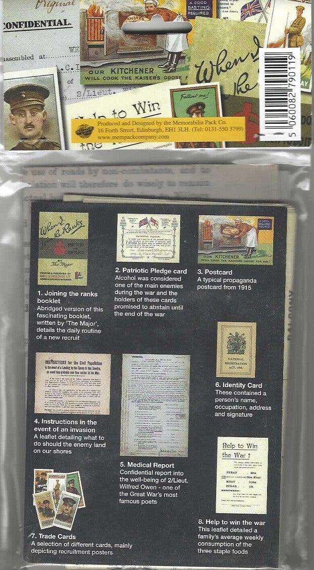 1/ Joining the ranks booklet, 2/ Patriotic Pledge card, 3/ Propaganda Postcard, 4/ Instuctions in the evet of an invasion, 5/ Medical report card, 6/ Identity Card, 7/ Trade Cards of the time, 8/ Help to win the War leaflet and 9/ a free Train Pass for travelling to the front.