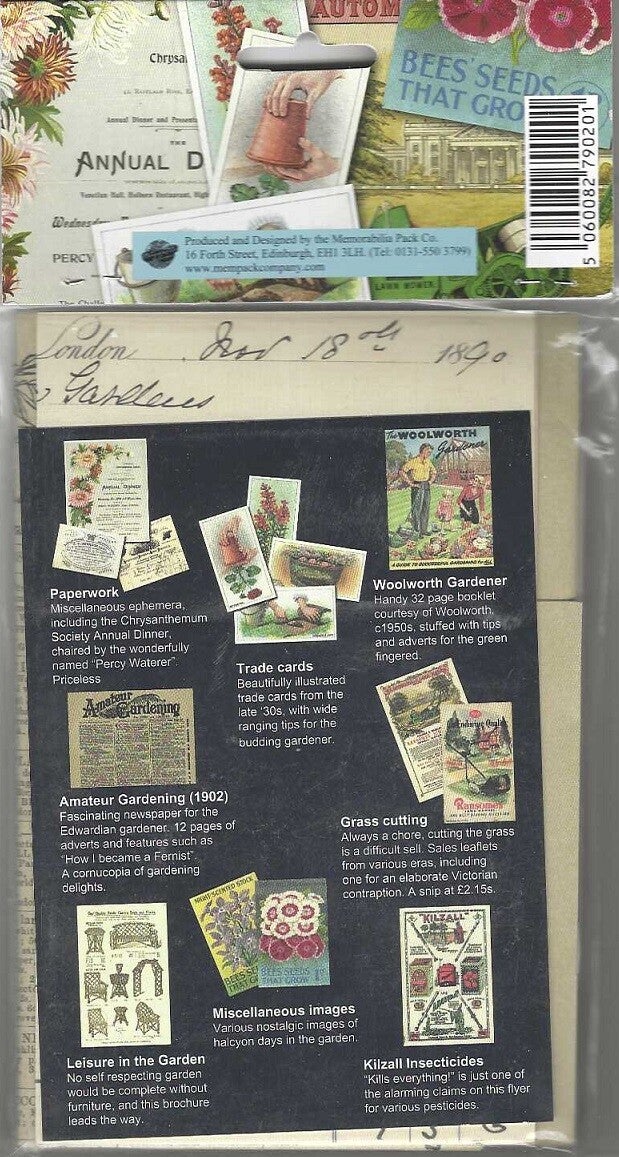 1/ Miscellaneous paperwork, 2/ Various Trade Cards, 3/ Woolworth Gardener [32 page leaflet], 4/ Amateur Gardening Newspaper [1902], 5/ grass Cutting leaflet [victorian], 6/ Leisure in the Garden leaflet for garden furniture, 7/ Miscellaneous Images of old seed packs and 8/ kilzall Insecticides leaflet