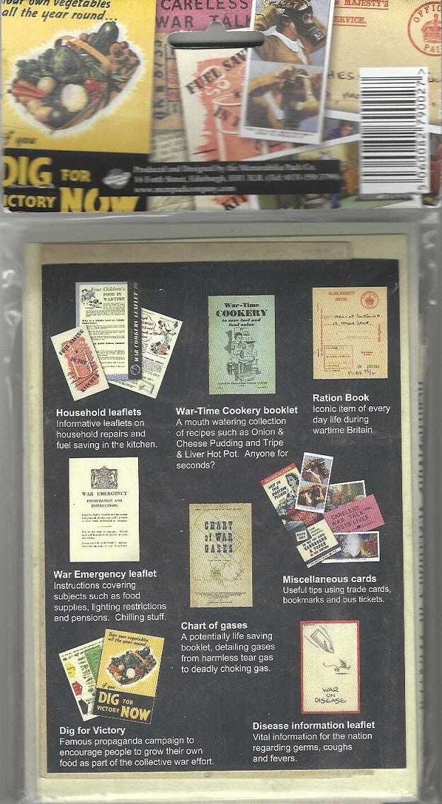1/ Household Leaflets re repairs and fuel saving, 2/ War Time Cookery Booklet, 3/ ration Book, 4/ War Emergency Leaflet covering food supplieslighting and pensions, 5/ Chart of gasescovering hamfull gases, 6/ miscellaneous collection of trade cards, 7/ Dig for Victory propaganda leaflet and 8/ disease information leaflet re germs, coughs and fevers